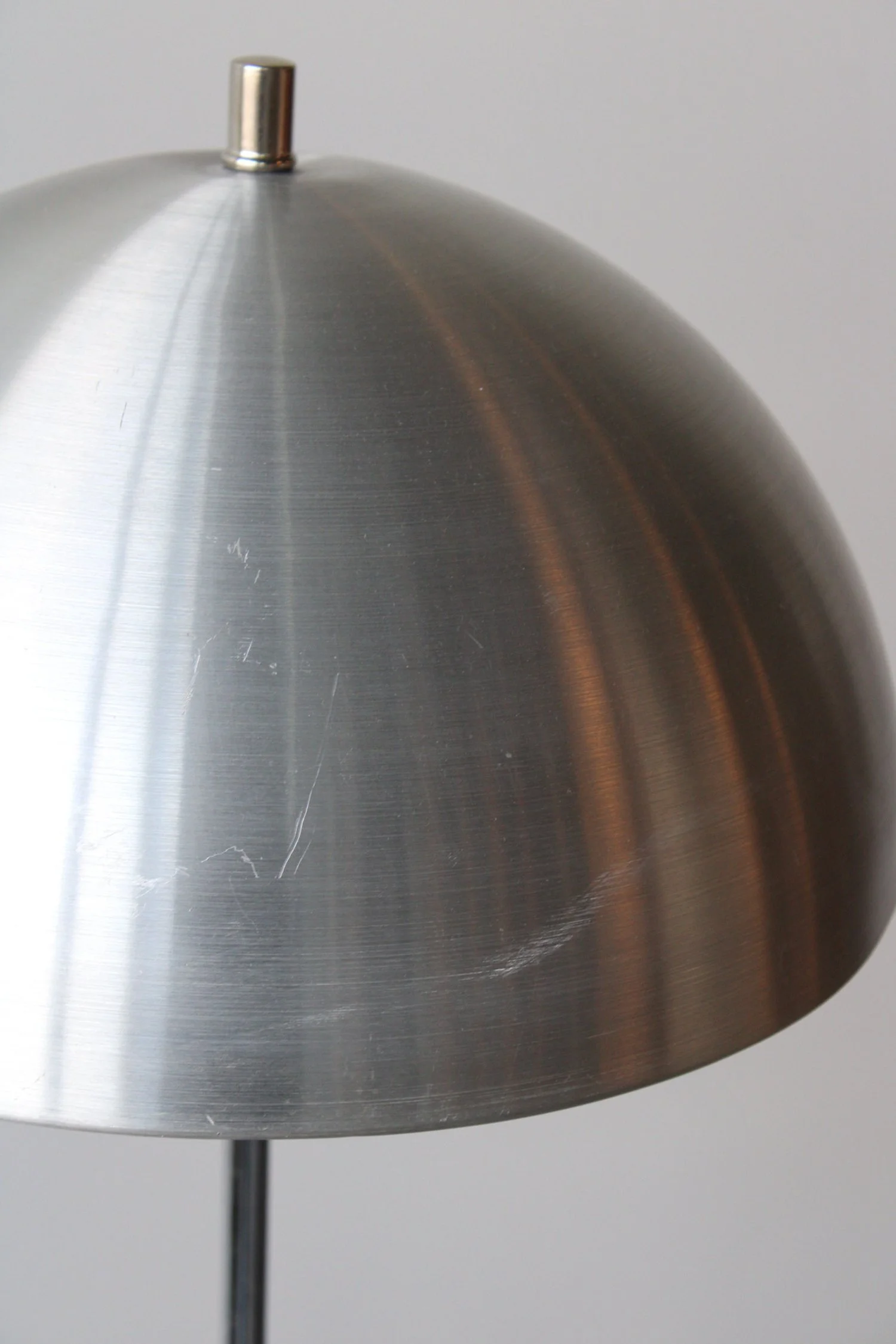 A stunning chrome pop lamp that elevates any interior, this vintage mushroom design exudes an industrial, space-age aesthetic. Crafted in brushed stainless steel shade, the shade produces a subtle, soft glow, directing light downward rather than through, creating a warm and inviting ambiance. Its minimalist shape is both sculptural and functional, making it a timeless addition to any space. Complete with original wiring, this lamp dates to the 1960s and is a perfect example of mid-century modern design at its most striking.