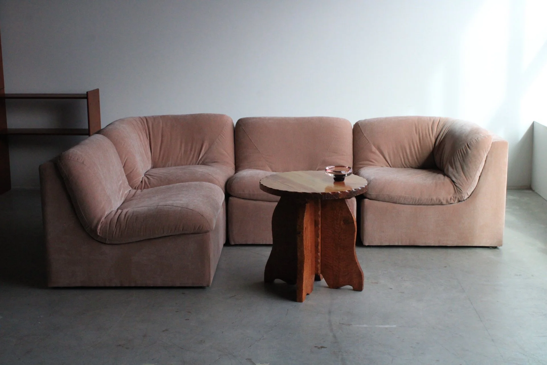 OUR FAVOURITE RESTORE YET! A rare and beautifully restored mid century modular sofa, newly upholstered in a soft, muted salmon-pink velvet that feels both romantic and quietly sophisticated. The high-quality poly-blend velvet offers a luxurious hand while remaining durable and fade-resistant, making it as practical as it is striking. Its modular design allows the configuration to shift and evolve with your space; playful, adaptable, and endlessly inviting. We are seeing a strong return of blush and soft pink tones in contemporary interiors, and this piece captures that movement effortlessly. The colour brings warmth without overwhelming a room, pairing beautifully with woods, chrome, stone, and modern neutrals. Timeless yet fresh, chic yet comfortable, this vintage sofa stands entirely on its own; a one-of-a-kind piece that blends mid century design with a palette that feels unmistakably current.