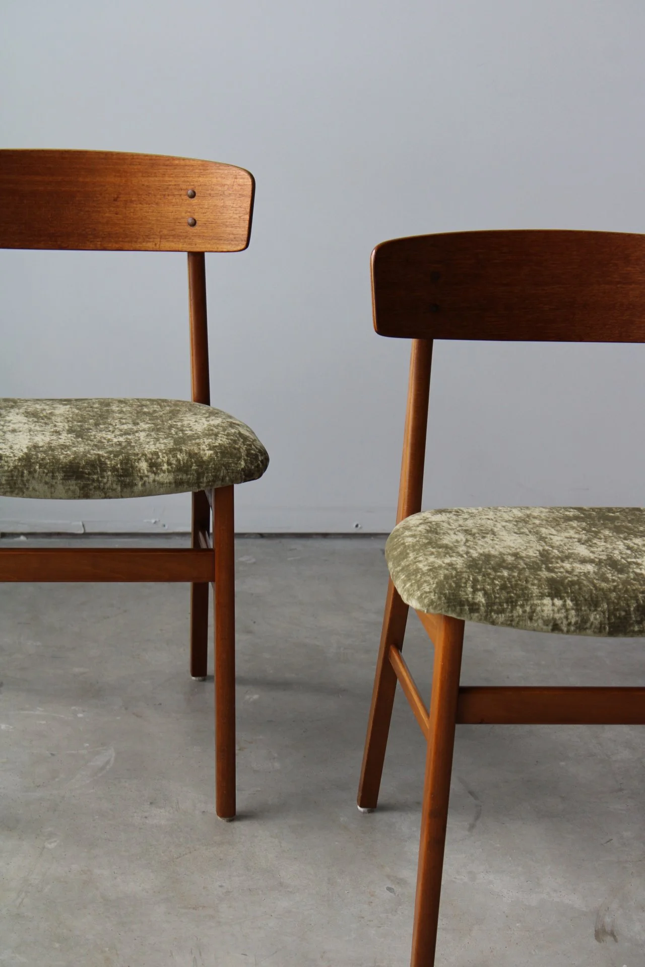 A stunning and one-of-a-kind collection of Farstrup dining chairs, constructed of beech and teak. This collection of dining chairs exude timelessness through their sleek and minimal design. The backrests are ergonomically shaped for comfort. Lightly restored and refinished. Upholstered in a crushed avocado green velvet. The vibrant yet grounding fabric is the perfect sophistication for all interiors. Made in Denmark, c.1960s.