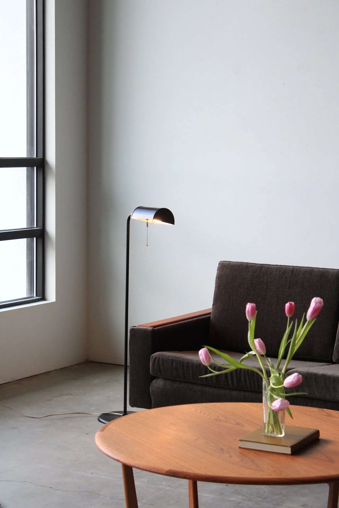 A stunning Danish floor lamp designed by Abo Randers featuring a minimalist black painted metal construction and adjustable head.