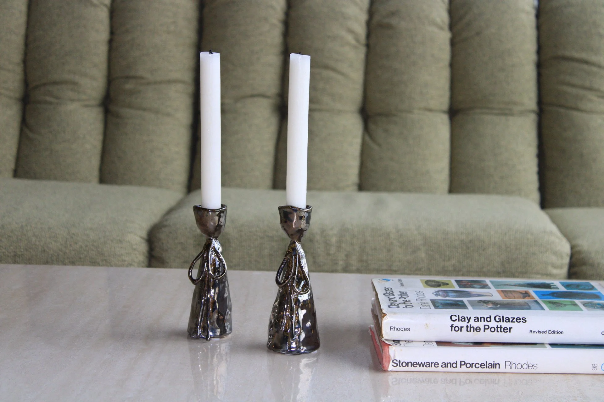 A stunning collection of handbill ceramic by Miranda Lancaster Moore in Victoria BC using mid-fire stoneware. A study in soft restraint which originated from pencil and paper and was born into a small OOAK batch collection. The bow that remains! This specific glaze has a beautiful metallic chrome finish with patina undertones.