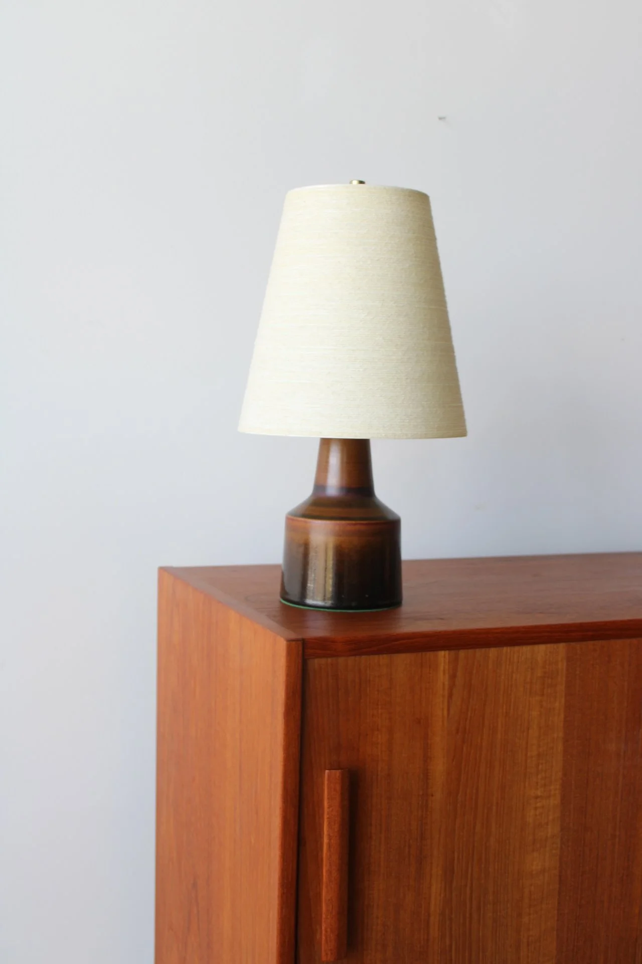 A stunning collectors stoneware base and original fiberglass shade by Canadian designers Lotte and Gunnar Bostlund. The perfect lamp to add warmth and simplicity to every day. A true collectors piece for designers and mid century enthusiasts. A timeless addition to any interior.