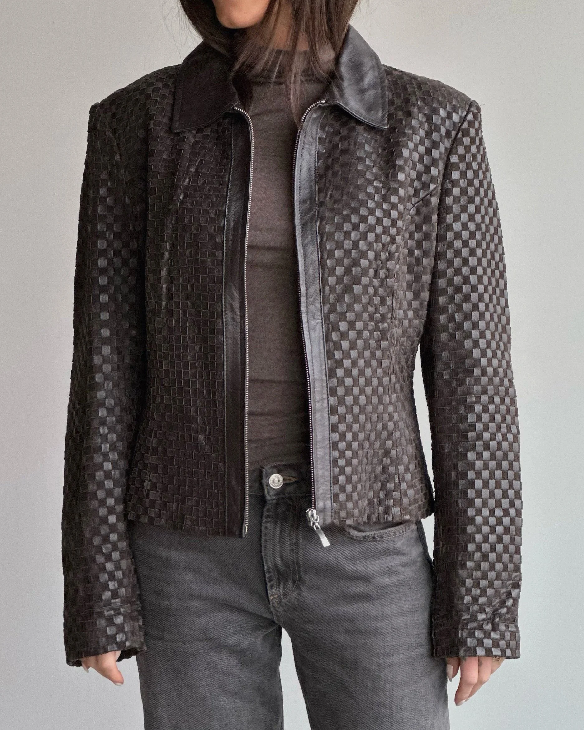 Vintage Wilson’s Leather woven jacket. Beautiful rich chocolate brown colour. Great shape and fit. Such a unique high quality piece. We are obsessed.