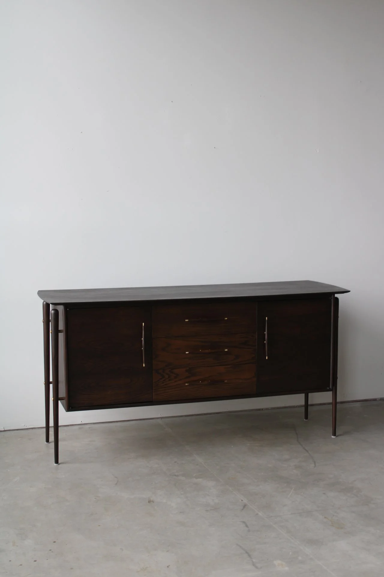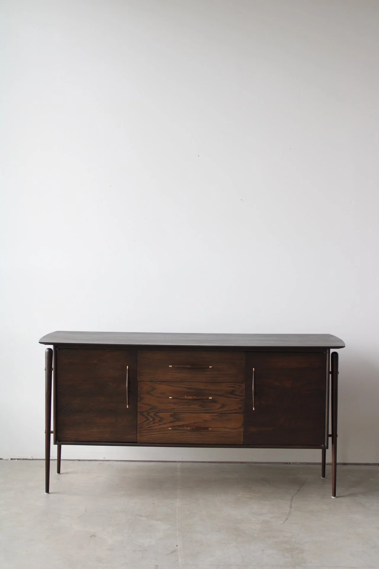 A breathtaking and increasingly rare RUSPAN sideboard by Russell Spanner, this exceptional 1950s piece has been professionally restored to a rich chocolate brown and sealed with a lustrous lacquer finish that deepens the grain and preserves its integrity for years to come. Retaining its original brass hardware, the sculptural handles and delicately tapered legs offer a striking balance of interest and refinement, lending a quiet sophistication that feels both grounded and elevated. There is a timelessness to its silhouette, a design language that remains effortlessly modern, echoing the enduring influence of Jean Prouvé and Charles and Ray Eames. Floating gracefully on its tapered legs, this Canadian-made piece brings both presence and versatility, an ideal anchor for living rooms, dining spaces, or entryways where function meets sculptural beauty. Holds substantial value in its design.