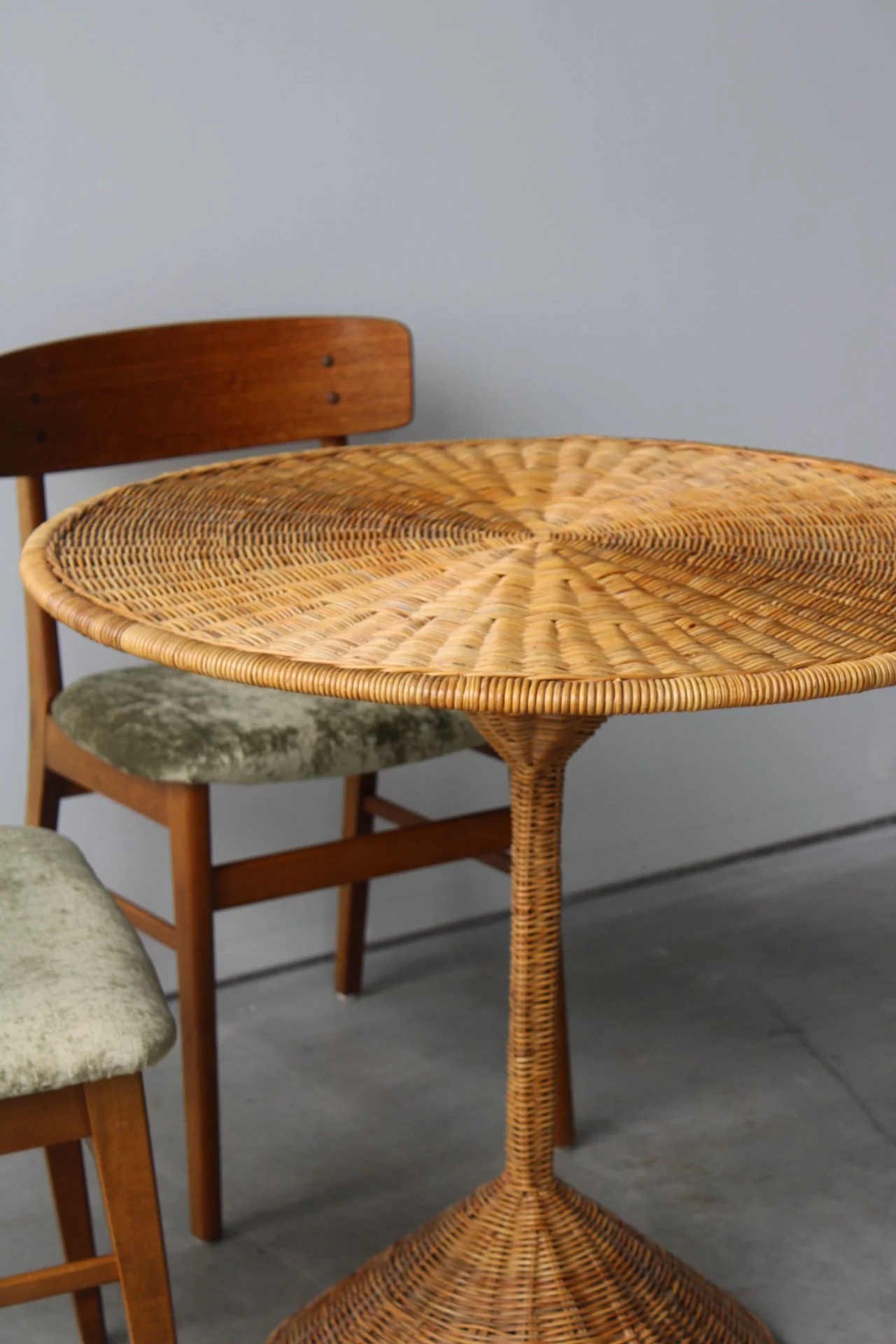 A true mid-century statement, this rattan tulip pedestal occasional table, attributed to Franco Albini, embodies sculptural elegance and tactile richness. Wrapped entirely in woven rattan, it introduces a remarkable sense of texture and warmth, its organic surface catching light in all the right ways. The graceful pedestal base offers both stability and visual lightness, supported by a sturdy interior metal frame that ensures lasting durability. Versatile in its function, it lends itself beautifully as a pedestal for a striking arrangement, a relaxed cocktail table, or a charming bistro setting in the kitchen, comfortably seating four. While a glass topper could be added to expand its surface and create a smoother plane, we find its raw, textural presence to be where it truly comes alive.