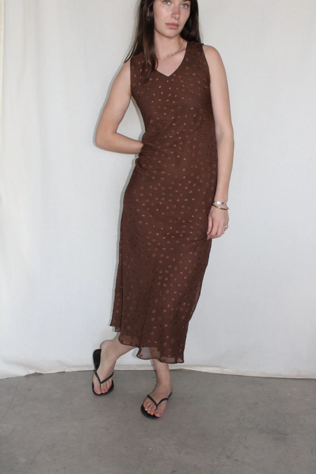 Vintage brown monochrome polka dot maxi dress. V-neck front and back, flattering sleek fit. And perfectly flowy. The perfect spring and summer dress. Dress it up or down!