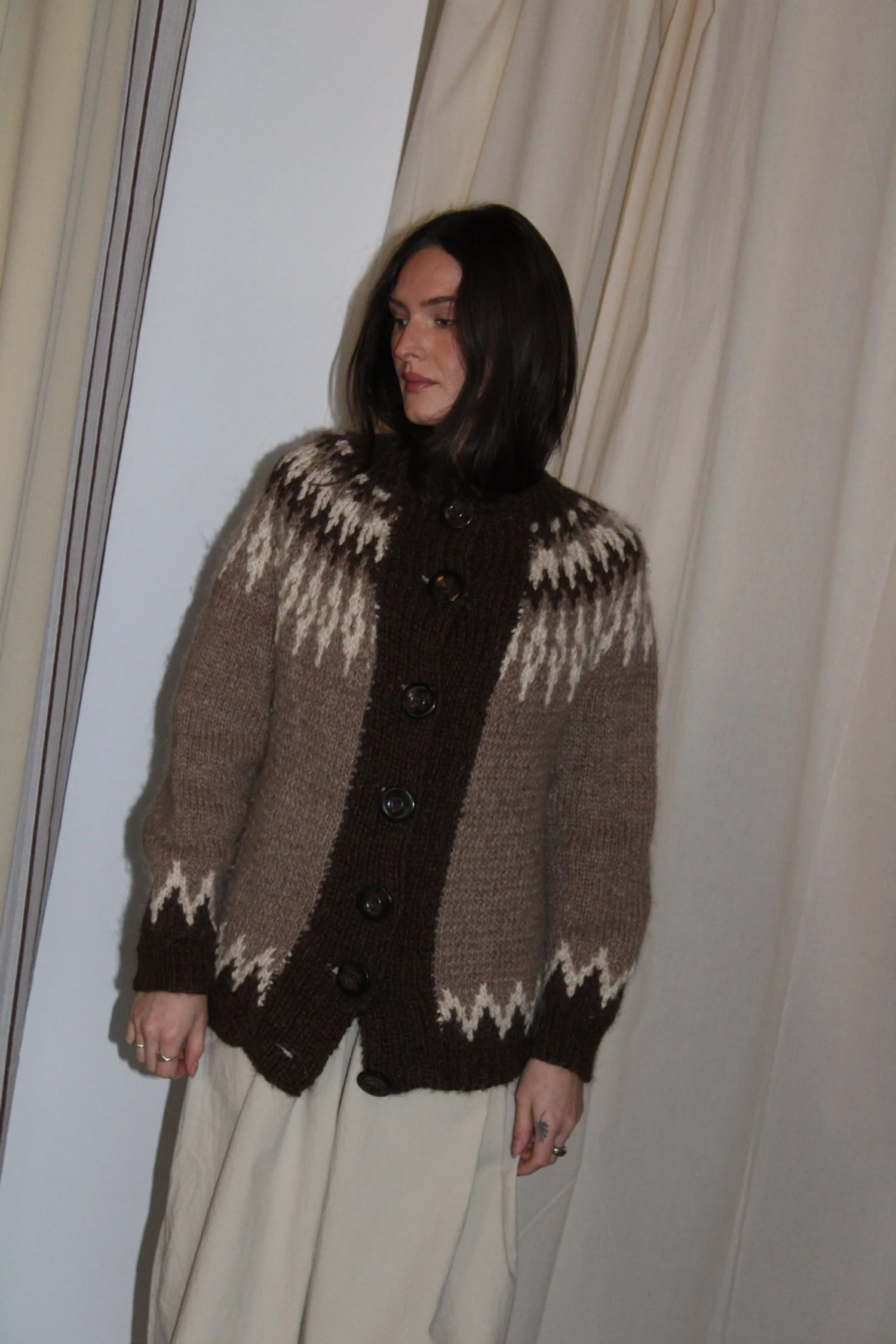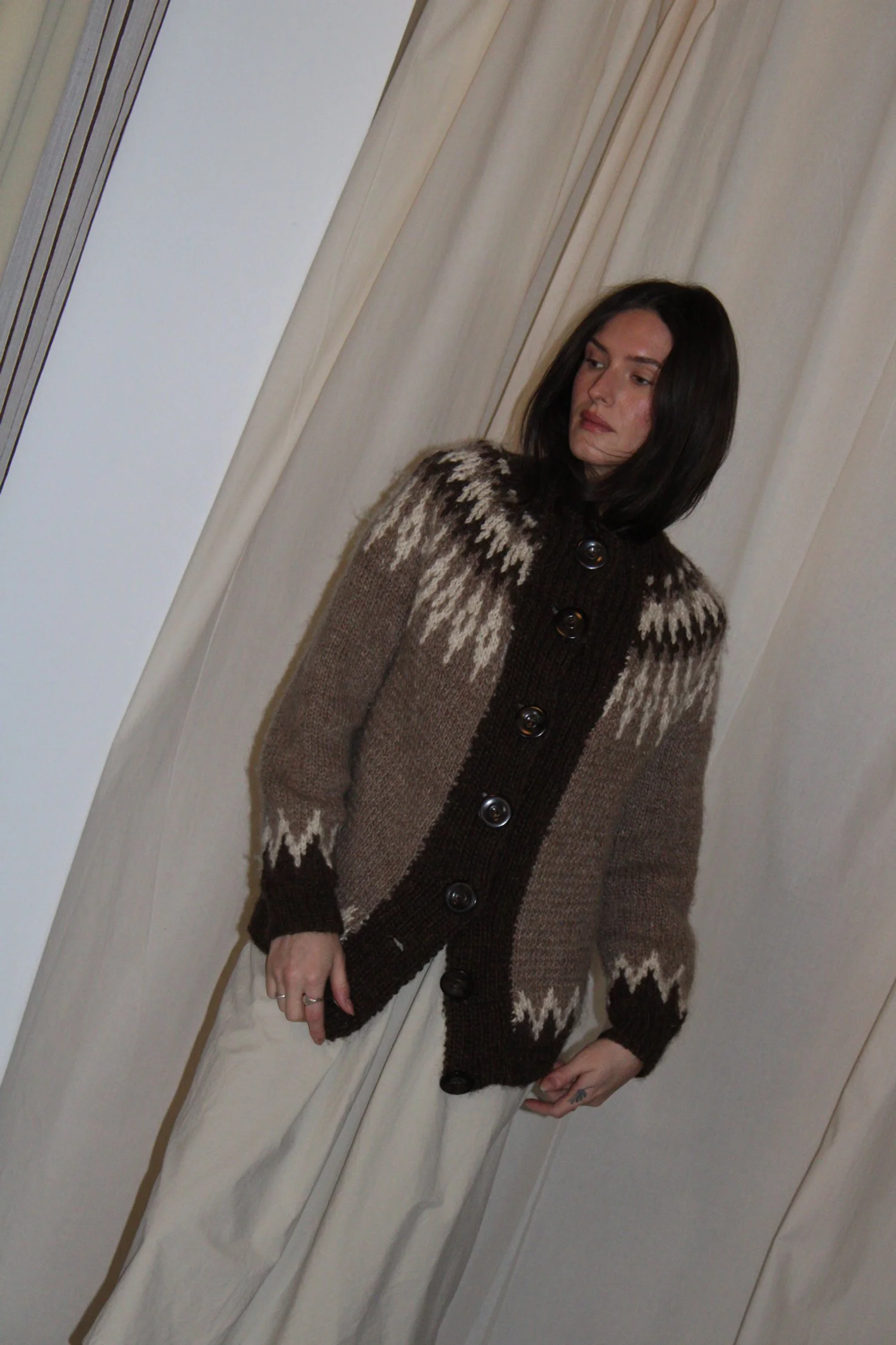A gorgeous hand-knit tonal cream and brown sweater with fun oversized chunky button details. Whether running errands or weekends at the cabin- this sweater is it!